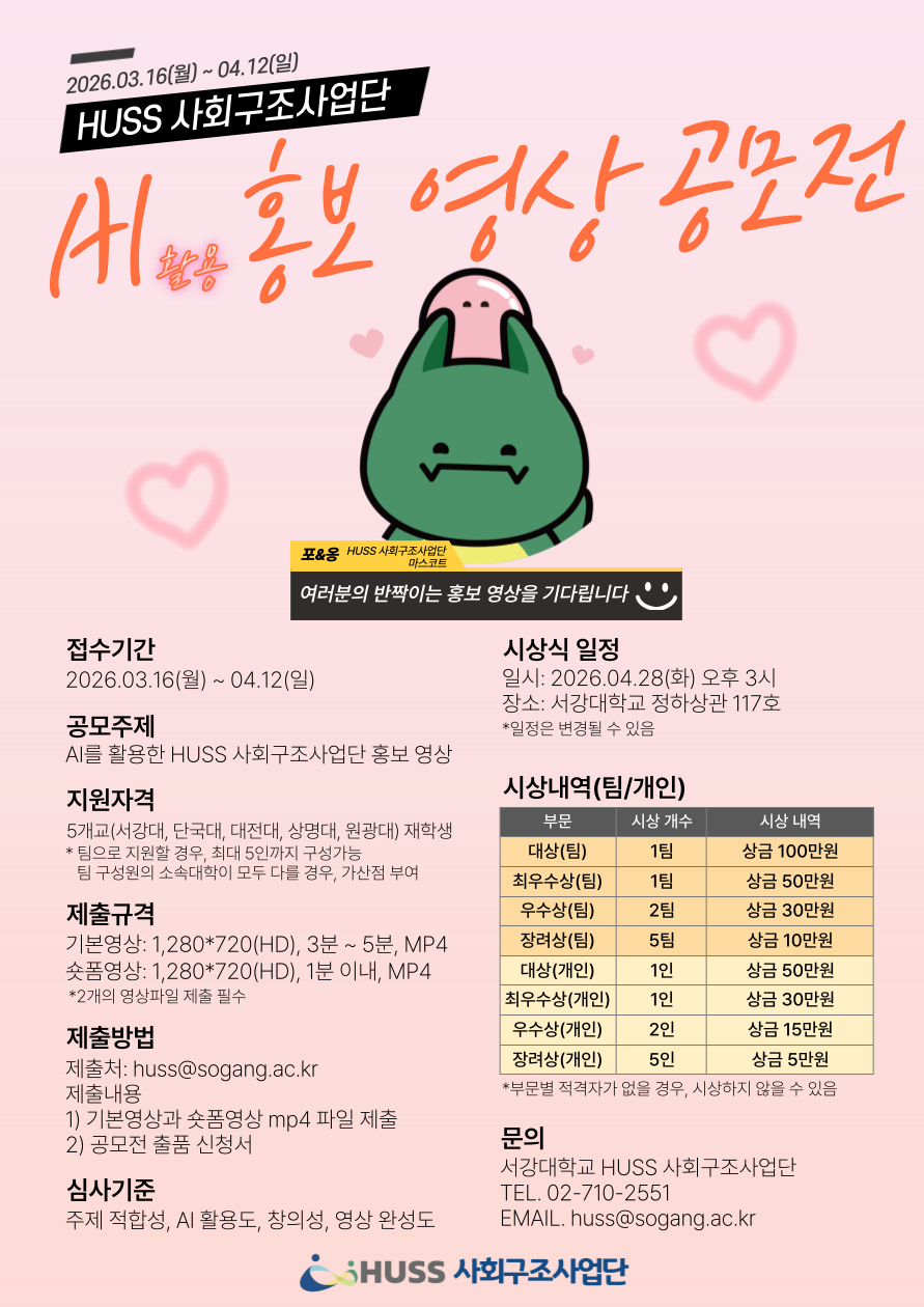 상명 [비교과] [HUSS 인문사회융합인재양성사업단] 'HUSS 사회구조사업단 AI 활용 홍보 영상 공모전' 안내 -